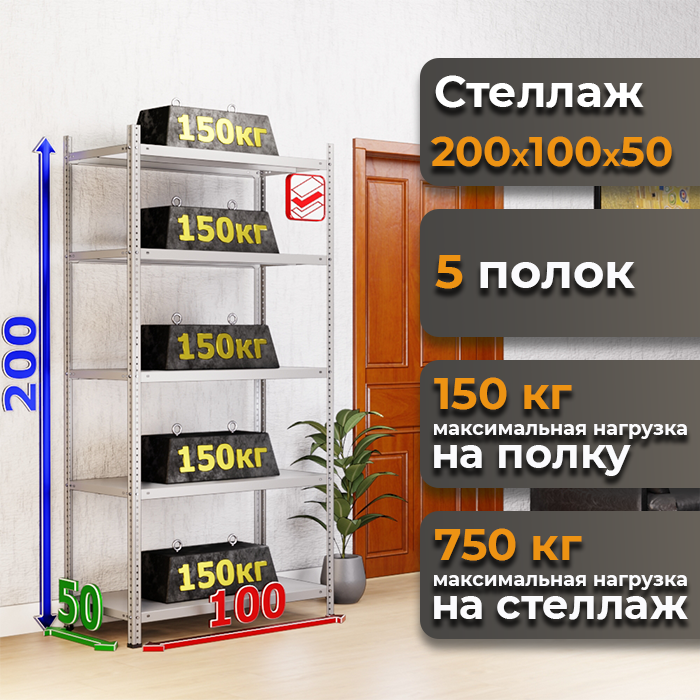• Высокая грузоподъемность: Каждая из 5 полок выдерживает до 150 кг, общий предел нагрузки на стеллаж – 750 кг.